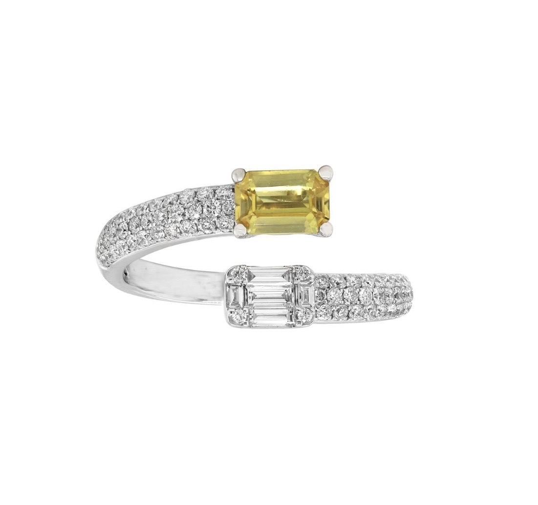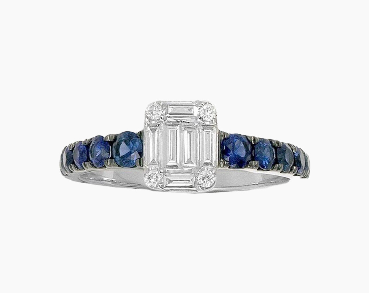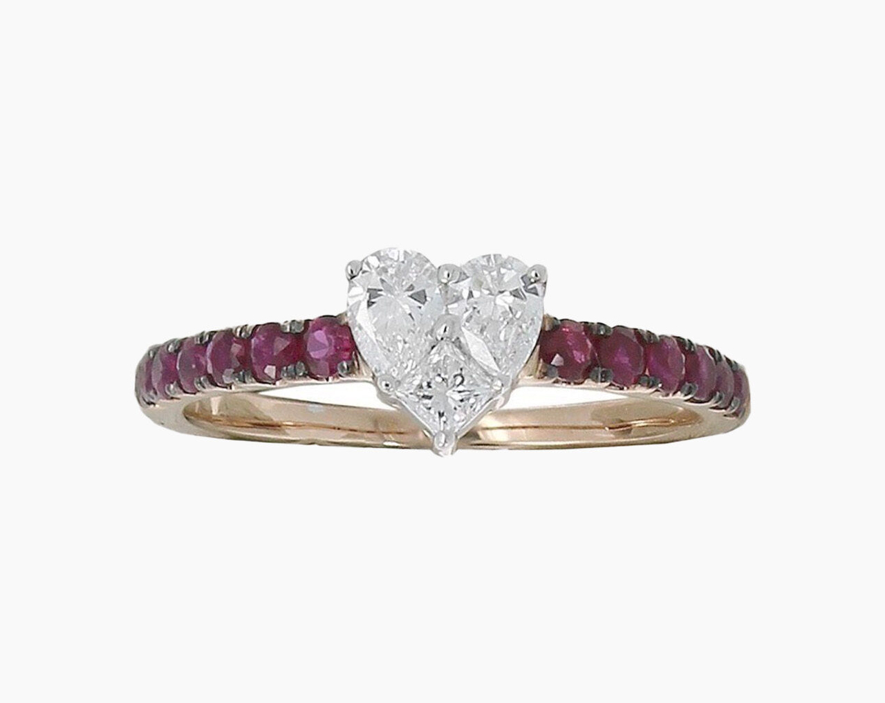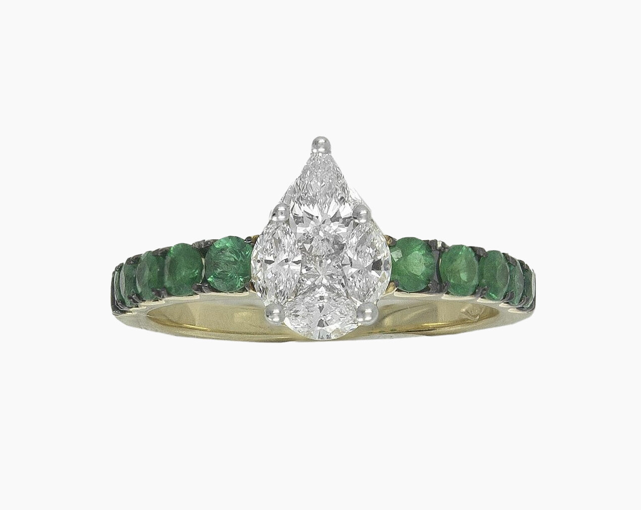 Precious in every sense, it comprises of rings made in white, yellow and rose gold set with green emeralds, red rubies and blue sapphires in the shoulder. The center stone is a magic set white diamond in the shape of an emerald, pear, marquise or heart, creating a striking contrast.