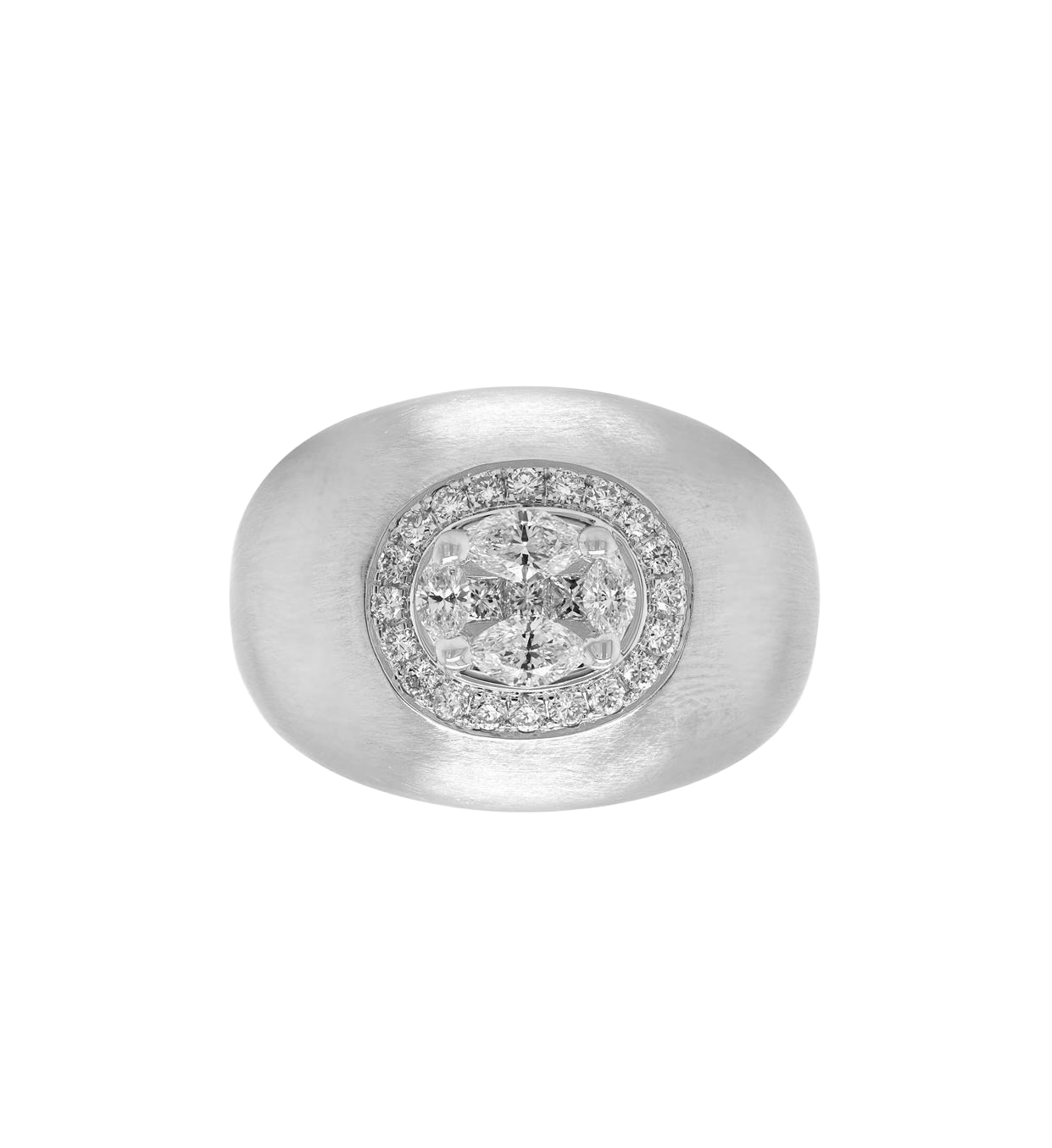 Each ring in this collection is expertly crafted in 18k white gold and richly set with natural high quality diamonds. The top is slightly pillow shaped and this soft rounding creates a subtle shine with every movement.