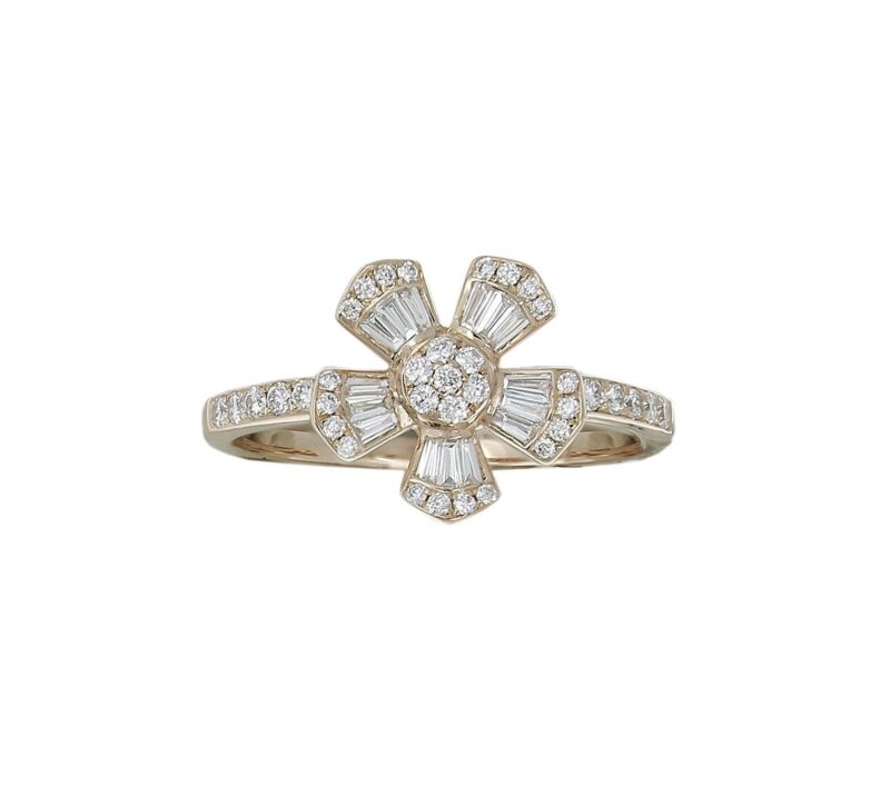5-Leaf Flower Ring in Rose Gold with Round and Baguette Shape Diamonds